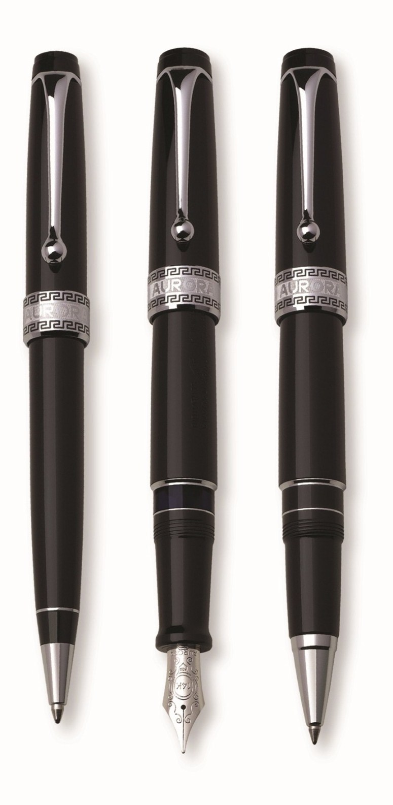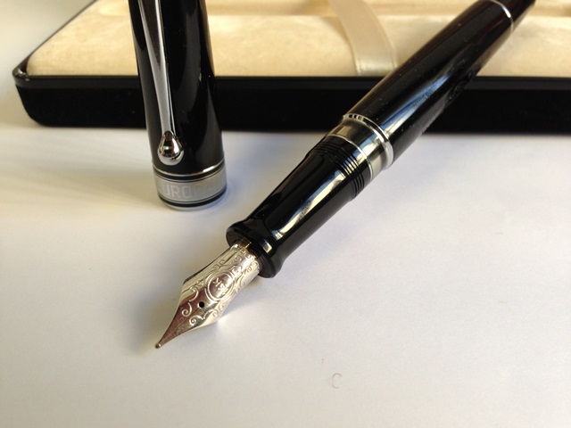 עט נובע , עם ציפורן זהב 14K , מצוייד במשאבת בוכנה קלאסית. בעט פטנט של אורורה – מיכל דיו רזרבי המאפשר לכתוב דף שלם כאשר הדיו אוזל.